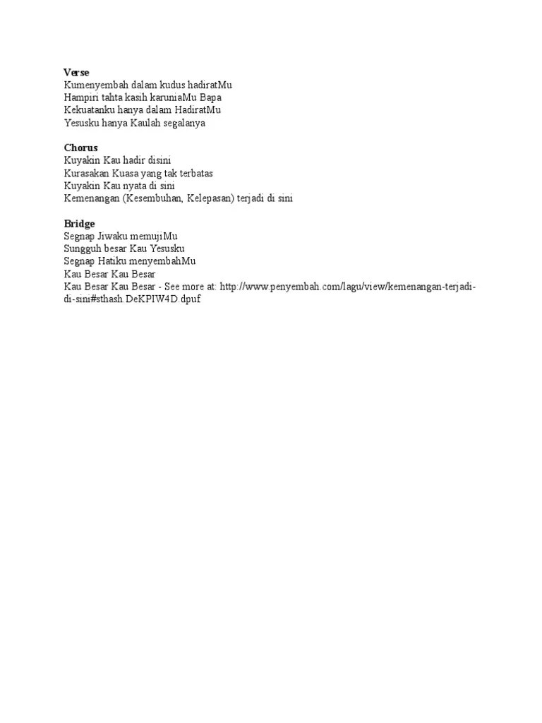 Lirik kemenangan terjadi disini kuyakin kau hadir disini kurasakan kuasa yang tak terbatas kuyakin kau nyata di sini kemenangan terjadi.